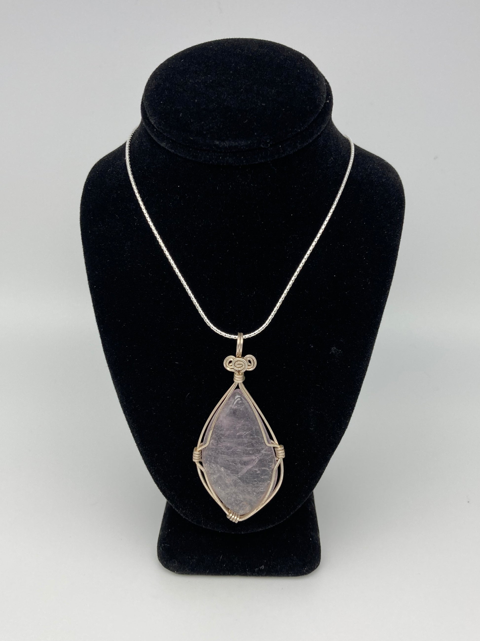 The hand-wrapped pendant has a large quartz crystal beautifully displayed in the center! The pendant itself is approximently 2 inches long.